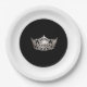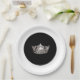 Plaque de papier de fête illustrée dans un jeu de couleurs combo noir et blanc avec une couronne d'argent imprimé au centre. Ajoutez votre texte personnalisé si vous le souhaitez ou modifiez les couleurs de la jante extérieure. Customisez cette assiette ou achetez comme indiqué.