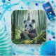 Un panda habillé d'un casquette de fête coloré lit une carte d'anniversaire assis dans une forêt luxuriante de bambous