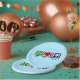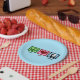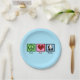 Un joli signe de paix vert, un coeur rouge et un beau panda dans un carré bleu. J'adore les ours de panda sur les assiettes de zoo mignonnes pour une fête d'anniversaire thématique safari.