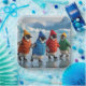 Four penguins glide on icy water, each wearing colorful vests and hats. Icebergs and snowy mountains form a serene backdrop