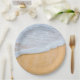 Plaques en papier avec photo d'une plage de sable brun doré au surf mousse blanc.