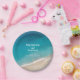 Plaques en papier personnalisées pour une Fête des mariées de destination de mariage de plage tropicale comportant un texte personnalisé avec des noms, la date du Mariage et l'emplacement. Ces assiettes en papier sont décorées de plusieurs nuances de vagues océaniques turquoise d'eau profonde, moody et bleu aqua qui s'écrasent sur une plage de sable, et de fontes vibes rétro de beach town pour un look moderne et minimaliste, parfait pour la mariée qui aime un style propre, simple, amusant et élégant pour sa douche nuptiale et le dîner répétitif ou mariage privé décontracté de plage.