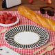 Cette plaque papier présente une bande radiale noire et blanche autour du bord avec un centre blanc et une bordure dorée. Parfait pour le Nouvel An ou toute autre réunion formelle.