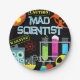 Plaques à papier d'anniversaire fol de scientifique, une grande conception que les tubes à essai de caractéristiques, un pot de globes oculaires, les bechers, et plus avec le texte bleu ont affilé avec le blanc qui lit le scientifique fou ! Nous avons les invitations folles assorties d'anniversaire de scientifique, le T-shirts, et l'Oreos plongé par chocolat !