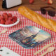 Un charmant ensemble de plaques en papier carré avec l'image d'une église d'hiver en vitrail.