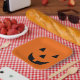Cette plaque en papier est présentée dans un joli design festif d'Halloween citrouille visage imprimé. Customisez cet objet ou achetez tel quel. Nous offrons également des serviettes en papier assorties pour ce design. Image stock freepik.com