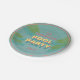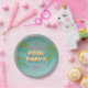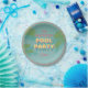 Pool Party Plate avec une eau de piscine illustrée et des frondes de palmiers dans un style moderne du milieu du siècle. Les décors comprennent des éléments de blues et de roses, des frondes en feuilles de palme, une piscine et un design rétro. Inclut le modèle pour la personnalisation personnelle.