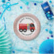 Plaques de fête d'anniversaire illustrant un camion-feu et une bordure en brique. Personnalisez le texte. Des serviettes de toilette, des invitations et bien d'autres encore sont disponibles à Jill's Paperie.