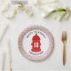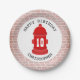 Plaques de fête d'anniversaire illustrant une borne d'incendie rouge et une bordure en brique. Personnalisez le texte. Des serviettes de toilette, des invitations et bien d'autres encore sont disponibles à Jill's Paperie.
