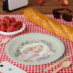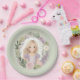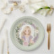 Ce joli design présente une illustration fantaisiste de Rapunzel entourée de fleurs vert pâle et violet.