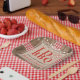 Ce design de style rustique dispose d'un arrière - plan en bois avec ruban rouge et blanc. En plus de cela est un burlap texture avec serif rouge et noir et écriture manuscrite police qui est tout personnalisable à votre événement, que ce soit une fête de fiançailles ou des douches en couple. Célébrez dans le style avec ce design de plaque!