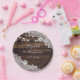 Elégante et romantique plaque de papier de mariage rustique inspirée du bois de grange, dentelle blanche fleurie et lampes à cordes.