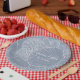 Océan mariage nautique plage de coquillages bleu blanc poussiéreux côtier élégant design de belles plaques rondes en papier. Copyright de l'image Marg Seregelyi Photography.