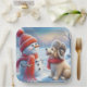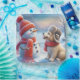 Un bonhomme de neige gai et un adorable chiot, tous deux vêtus d'une tenue d'hiver chaleureuse, partagent un moment de neige sous un ciel pastel