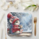 Une souris douillette en chandail rouge et un casquette assis par une fenêtre gelée tenant une tasse de cacao chaud tout en admirant un paysage enneigé avec pins et flocons de neige
