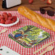 Two squirrels with blue backpacks are playing chess on a red and white checkered blanket in a sunlit park