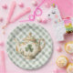 These whimsical St Patrick's Day paper plates features a watercolor Clover Tea Pot with a coordinating green and white gingham background.