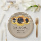 Plaques de papier mariage de burlap et de tournesol personnalisées avec des tournesols et des lampes à cordes sur un arrière - plan de burlap. Objets correspondants disponibles pour compléter ces plaques de papier mariage à fleurs rustiques. Personnalisez facilement à toute occasion.