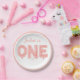 L'assiette de la fête Rosy Pink ONE Balloon, en coordination avec les invitations correspondantes aussi dans la boutique!