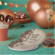 Un petit garçon prépare des assiettes de baby shower avec des haricots à café sur un arrière - plan rustique en bois.