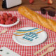 Un Happy Dude style rétro assiettes fête d'anniversaire avec rayures jaune, orange et bleu.