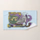 Un sorcier tout en violet tenant un bâton qui a une boule de cristal violet. Un petit dragon vert, un noeud celtique, une bougie et une bordure d'automne feuilles le tout dans un décor bleu clair