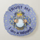 Alter Zauberer mit blauem Kap, der Kristallzauberkugel anschaut.