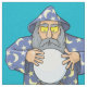 Alter Zauberer mit blauem Kap, der Kristallzauberkugel anschaut.