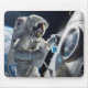 An astronaut in a full suit cleans the spacecraft window with a spray bottle and paper towels, framed by the expansive view of Earth in the background