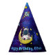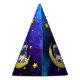 Astronaut Outer Space Kids Party Hat - Auf einem wunderschönen Hintergrund des Sternenhimmels posiert ein Astronaut, eingebettet in einen Halbmond, umgeben von Sternen. Das Astronautenbild erscheint an drei Stellen um den Hut herum. Auf der Vorderseite am Gipfel ist ein Raketenschiff und ein Stern. Die Vorderseite des Hutes hat einen anpassbaren Text unten, der lautet: "Happy Birthday, Ethan" Was für eine lustige Sache für Kinder zu tragen, während sie den Geburtstag eines zukünftigen Astronauten feiern!
