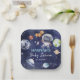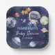 Lassen Sie diese Galaxie-Planeten-Kinder Babydusche Party-Papier-Teller für die Weltraum-Thema Geburtstagsparty Ihres Kindes. Illustration von Aquarellplaneten und Raketen. Der Text unter ihnen sagt "Hannahs Babydusche". Fügen Sie hier den Namen Ihrer Kinder hinzu, um das Design anzupassen.