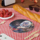 Astronautenkatze, die eine Pizzasuppe jagt Pappteller