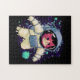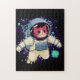 Eine Katze, die in einem Raumanzug verkleidet ist, schwappt durch eine farbenfrohe Galaxie, die mit kleinen Planeten und Sternen gefüllt ist. Sein eigenartiger Ausdruck suggeriert eine skurrile Reise durch den Weltraum.