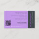 Le Carte de visite Art Workshop Purple Artist présente une activité artistique sur une surface noire avec des fournitures d'art. Il a une typographie propre, avec un nom d'entreprise à angle violet au centre et la liste des services aux entreprises à l'avant. Le nom de l'entreprise à l'arrière est sur une bande noire position verticale. De plus, les détails de l'entreprise sont dans un arrière - plan violet plus le code QR. L'ensemble du concept est contemporain et ludique, ce qui le rend passionnant pour un carte de visite d'artiste.