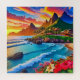 Eine lebendige Küstenlinie erstreckt sich entlang üppiger grüner Berge unter einem farbenfrohen Sonnenuntergang. Wellen stürzen sanft auf den Sandstrand, während ein kleines Dorf zwischen Hügeln und Ozean liegt.