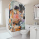 eine abstrakte, kräftige Collage auf einem Duschvorhang.. wunderschöne, malerische Fragmente moderner Kunstwerke. Orange und Korallen, Schwarz, Wein, Aqua und Lavendel.