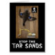 Entenmontage mit geölter, toter Mallardente, Erdbewegungsausrüstung, Schädel und Kreuzknochen. Text mit dem Text "STOP THE TAR SANDS" erscheint ebenfalls. Wehe an Wasservögel, die in einem giftigen Absetzteich in Alberta landen, wo ein extrem zähes Erdöl aus Teersand (auch Ölsand genannt) mit schrecklichen Umweltauswirkungen gewonnen wird. Der Teersand von Alberta besteht aus schwerem Rohöl, das mit Sand, Ton und Bitumen vermischt ist. Die Gewinnung beinhaltet das Verbrennen von Erdgas, um ausreichend Wärme und Dampf zu erzeugen, um das Öl aus dem Sand zu schmelzen. Bis zu fünf Barrel Wasser werden benötigt, um einen Single Öl zu produzieren. Jeden Tag werden Millionen Gallonen Wasser mit Chemikalien wie Arsen, Kupfer, Blei und Zink kontaminiert, um im Grunde Teersandöl (verdünntes Bitumen genannt) vom Sand zu trennen. Aber das Wasser ist nach diesem Prozess so kontaminiert, dass es in toxischen Schlammgruben, so genannten Bergeteichen, gelagert werden muss. Es wird geschätzt, dass täglich 3 Millionen Gallonen kontaminiertes Wasser aus Seen in den Athabasca Fluss Alberta und die umliegende Landschaft strömen. Bitte nein zum Teersand sagen!