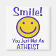 Lege ein menschliches Gesicht auf den Atheismus mit einem hellgelben, blau umrissenen Gesicht mit blauen Buchstaben, die sagen: "Lächle! Sie haben gerade einen ATHEIST getroffen."