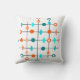 Dieses Kissen hat Mitte des Jahrhunderts ein modernes Design eines Gitters in schwarzen Linien mit orangen und aquamarinen Kreise und Diamanten.