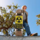 Eine Plattform mit dem Blick des korrodierten verrosteten Metalls und ein Atombunker unterzeichnen herein die Mitte