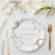 Einfache, aber elegante Teller für Hochzeitsfeier; inspiriert von modernen Designs aus der Mitte des Jahrhunderts, mit atomaren Sternexplosionen und Formen in modernen Erdtönen aus Rost, Hellgrün, Weiß und einem hübschen rosafarbenen Beige.