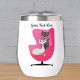 Dieser Getränketucker hat Atomikatzen, eine schwarz mit grünen Augen, eine weiß mit gelben Augen, die in einem Vintag rosa Stuhl zusammensitzen. Passen Sie Ihren Text mit der Vorlage an.