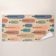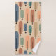Dieses Handtuchhandtuch ist mit einem pfirsichfarbenen Waschtuch, einem aquamarinen Handtuch und einem Badehandtuch mit einem modernen Design von langen Ovalen in pfirsichfarben, grün, blau, aquamarin und hellbraun mit schwarzen Linien und Kreise an den Enden ausgestattet.
