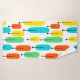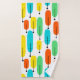 Dieses Set ist mit einem orangefarbenen Waschlappen, einem grünen Handtuch und einem Badehandtuch mit einem modernen Design aus langen Ovalen in Gelb, Orange, Grün und Türkis ausgestattet, das an den Enden schwarze Linien mit Kreise aufweist.