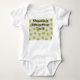 Dieser Babybodysuit hat ein modernes Design aus beigefarbenen Bögen, die sich auf weißem Hintergrund wiederholen, mit sich wiederholenden grünen goldenen Kreisen mit dunkleren grün-goldenen Sternexplosionen.