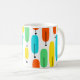 Diese Tasse hat ein modernes Design von langen Ovalen in Gelb, Orange, Grün und Türkis mit schwarzen Linien mit Kreisen an den Enden.