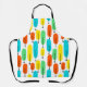 Diese Schürze hat ein modernes Design von langen Ovalen in Gelb, Orange, Grün und Türkis mit schwarzen Linien mit Kreisen an den Enden.