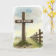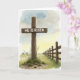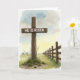 Das vordere Design zeigt eine hohe, hölzerne aufrechte Form mit einem Querbalken, leicht außermittig im Vordergrund platziert, mit den in Weiß auf den horizontalen Balken aufgemalten Worten „ER IST AUFERSTANDEN“. Das Holz wirkt rau und verwittert, und kleine Büschel grünen Grases und dünne Triebe sammeln sich an seinem Fuß wie ein stilles Zeichen neuen Lebens 🌷. Rechts verläuft ein abgenutzter Holzzaun in die Ferne, der den Blick sanft über ein offenes Feld führt, das ruhig und einladend wirkt. Das Land erstreckt sich in sanften Grüntönen, und das Licht fällt darauf wie am frühen Morgen, was der Szene eine zarte, herzliche Stimmung verleiht. Darüber wechselt der Himmel von einem blassen Gelb am Horizont zu einem sanften Blau und gedämpften Grau und bildet einen beruhigenden Hintergrund. Der Hintergrund hat eine Aquarell-Optik, während die Holzmaserung und die Kanten des Zauns deutlicher definiert sind, was Textur und Tiefe hinzufügt. Die weiße Schrift steht zentriert auf dem Querbal