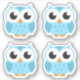 Aufkleber mit einer niedlichen, blauen Eule aus Cartoon. Blatt mit vier Aufklebern.