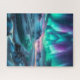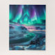Northan-Lichter (Aurora Borealis), die vom Himmel über eine schneebedeckte Landschaft hinabsteigen, und ein Fluss, der das Auge in eine entfernte Stadt führt, leuchten in der Nacht durch Martinspixs.